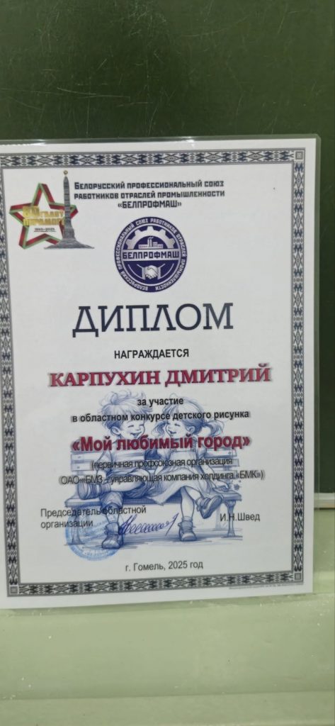 Карпухин Дмитрий, учащийся начальной школы №2, стал обладателем диплома за участие в областном конкурсе детского рисунка под названием «Мой любимый город». Награждение состоялось благодаря поддержке первичной профсоюзной организации ОАО БМЗ-управляющая компания холдинга «БМК». Этот конкурс стал отличной возможностью для детей проявить свои творческие способности и поделиться своими впечатлениями о родном городе. Дмитрий с гордостью представил свой рисунок, который был оценён жюри. Поздравляем его с этой замечательной наградой и желаем дальнейших творческих успехов!