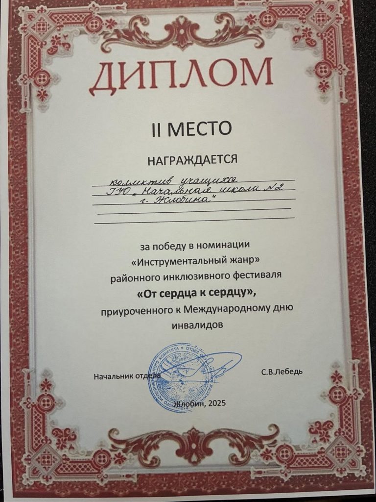 В этом мероприятии принял участие коллектив учащихся начальной школы №2 г. Жлобина. Ребята показали высокий уровень мастерства и завоевали диплом за второе место в номинации «Инструментальный жанр». Подготовила юных талантов учитель музыки Германова Людмила Михайловна. Поздравляем всех участников и желаем новых творческих успехов!